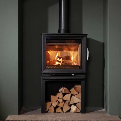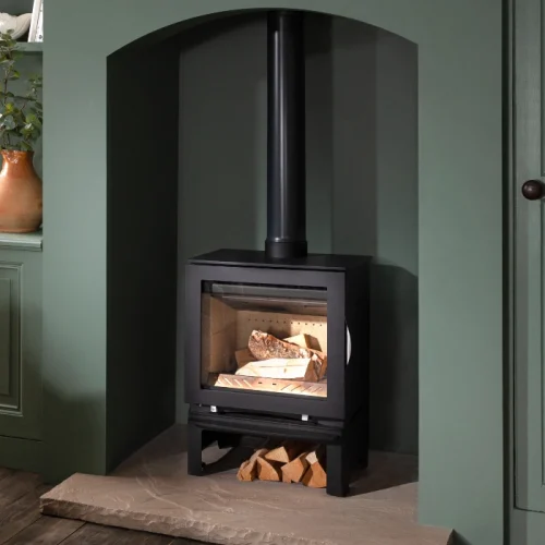 The Arada M Series Widescreen stove features a solid cast iron door along with a large glass viewing window. A stylish stainless steel door handle and air controls give a modern twist to an otherwise timeless stove, making this a considerable choice for both contemporary and traditional interiors. The Arada M series can be purchased with an optional set of feet, stand or log store to provide extra height, allowing installation into both fireplace and free-standing settings.