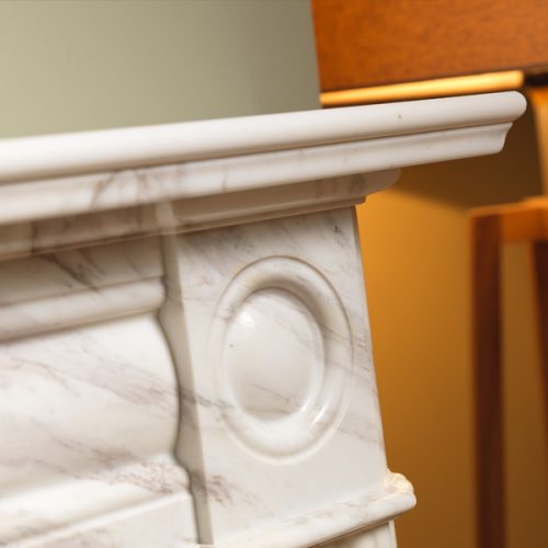 A beautifully handcrafted Georgian inspired period mantel which captures the period with carved roundels on the corner blocks and moulded detailing to the legs and mantel top. Available in a stunning Kallos marble, this surround will make a grand centrepiece in either a traditional or contemporary home.