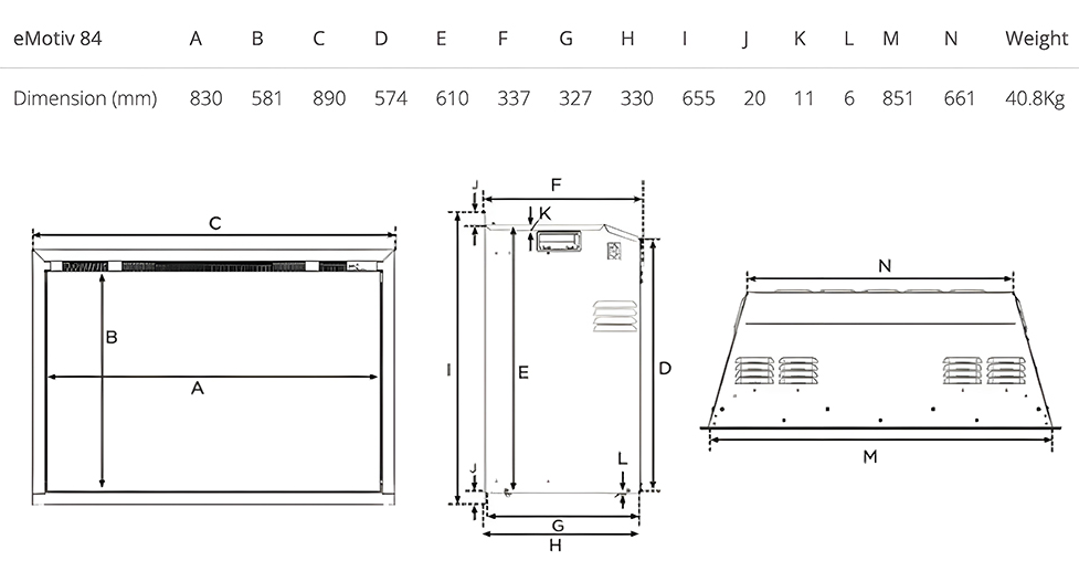- Large Scale Statement Design – The eMotiv 84’s tall, glass fronted design provides a bold alternative to landscape electric fires, perfect for large rooms or media wall integration
