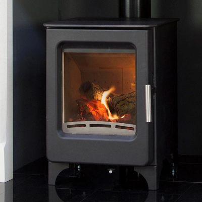 The Ashcott and Ashcott wide stoves have a deeply contoured cast iron door, slim convection top plate and sculptured cast iron legs. The door has a magnetic mechanism for easier closing. The stoves compact design is a perfect blend of classic and contemporary styling. The fire is captured through the large ceramic glass window and the stove is finished with milled stainless-steel handle and air control knob.