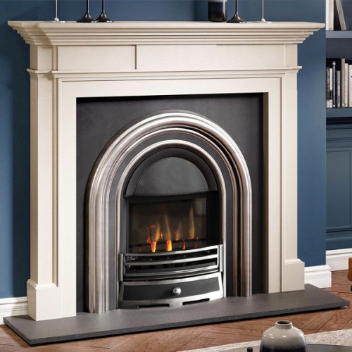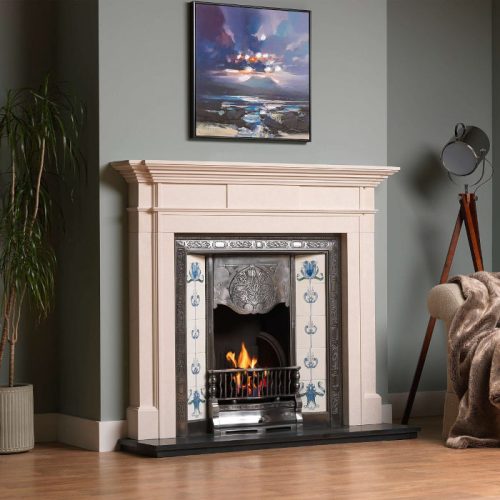 Aegean Limestone is a whiter option compared to Portuguese Limestone and has a soft, speckled grain, which works well in a variety of settings. It is a superb choice for fireplace construction and the Milbrooke with its clean lines and stepped edge detail works especially well in this opulent material.