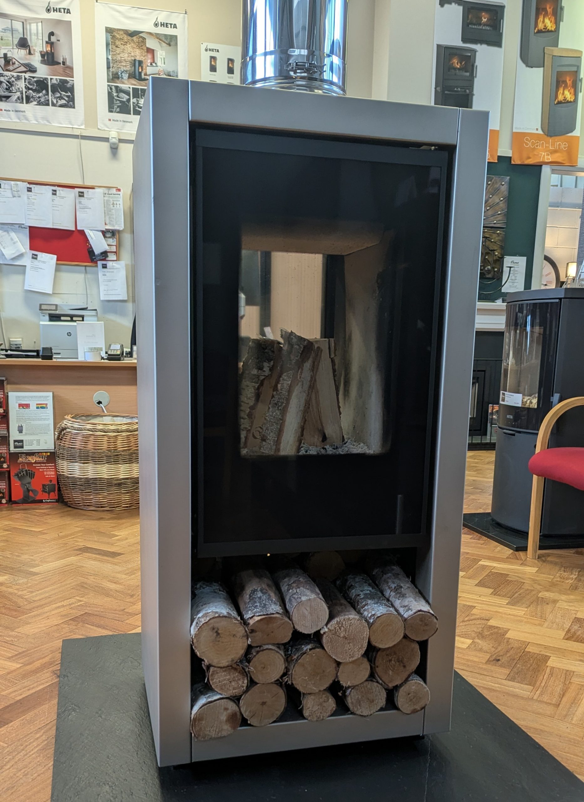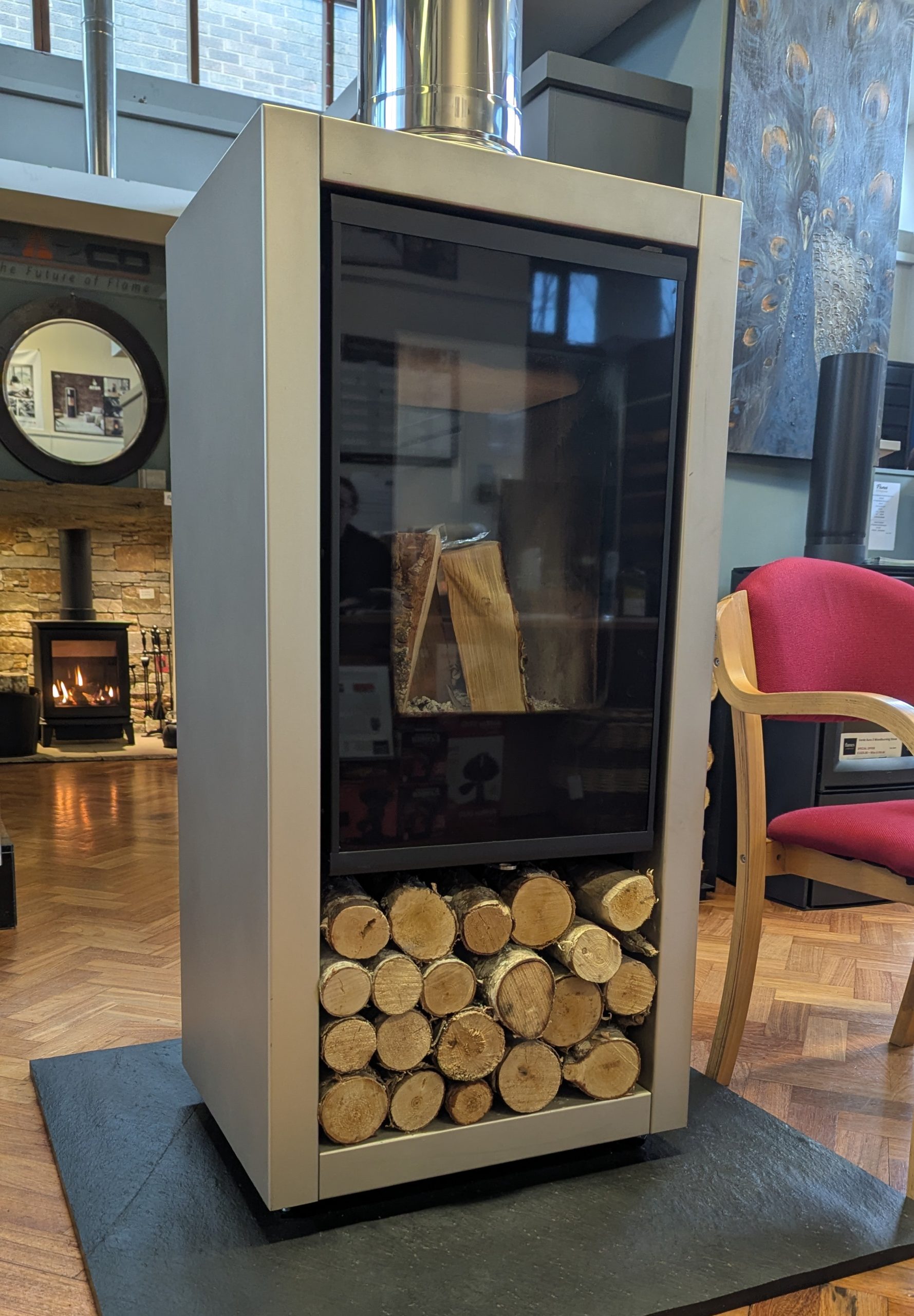 The a8 is a modern, elegant high capacity wood stove with open or closed combustion systems, a tunnel wood stove with windows on 2 sides and a useful log storage space. It is available in a Steel Pearl finish and It has a heat output of 7.7 kW and external air connection for high efficiency and clean burning.